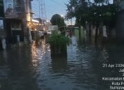 Palembang, Palembangterkini.com — Banjir kembali menggenangi sejumlah ruas jalan di pusat Kota Palembang pada Selasa (21/4/2026) sore. Salah satu titik yang terdampak berada di kawasan pertigaan Jalan Seroja, tepatnya di sekitar Universitas Tridinanti Palembang dan Hotel Parkside Palembang.